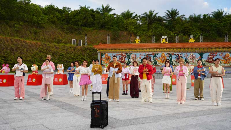 除了西天宫这一主景,MV也取景于瓜拉庇劳中华华小,艺人们在学校操场齐跳手势舞,吸引全校学生围观,场面十分有趣。提及这次的拍摄体验,每年自嘲是“老鼠屎”的Owen叶剑锋,再次感叹舞蹈难度升级:“我觉得自己是‘破坏者’角色,总是手脚不协调,跳起来像机器人!”他还幽默提醒大家,拭目以待他的“表演”。