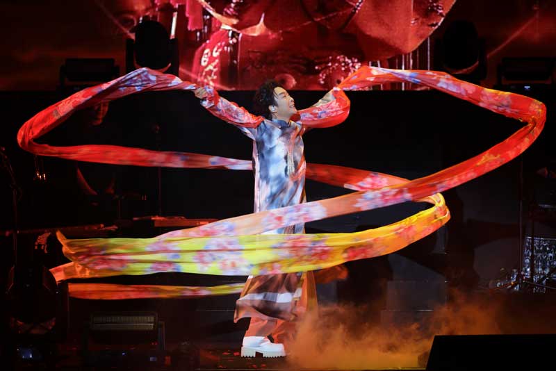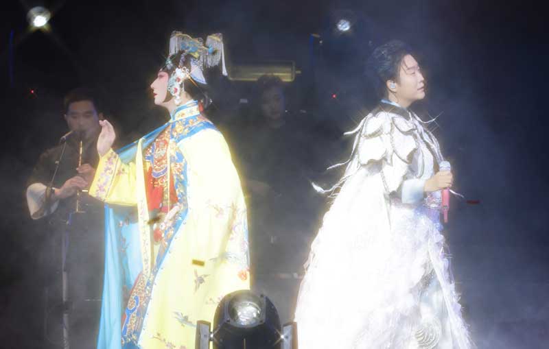 随着他换上黑白水墨斗篷演绎《梨花颂》及《虞美人》,并由京剧老师重现霸王别姬舞剑殉情,在以真假声演唱《赤伶》 时更耍了一段京剧《仙女散花》的长绸舞,淋漓精致的中国传统艺术文化表演令全场惊叹!