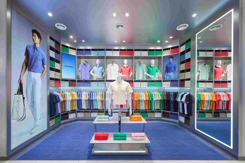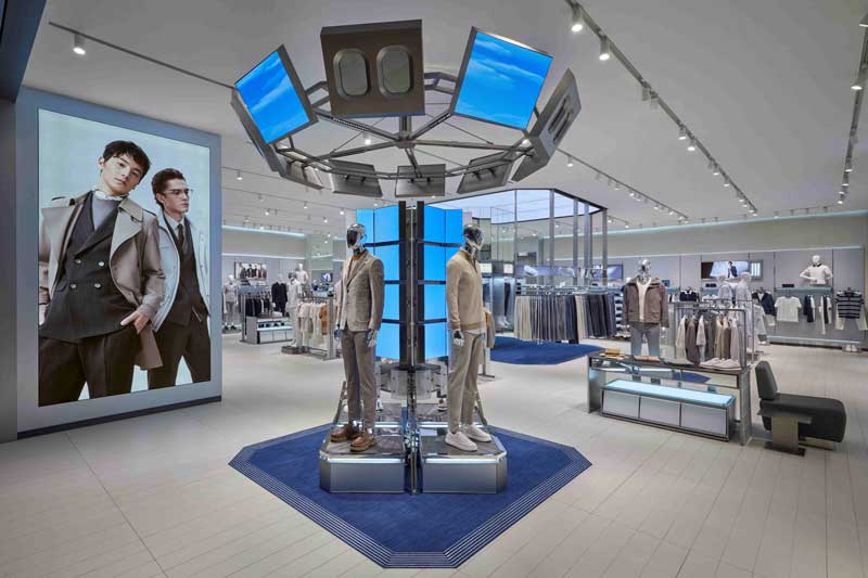 宽敞的展示区陈列着利郎种类繁多的男装系列,从西装到都市休闲装,再到精致的日常单品,应有尽有。空间内还设有一个充满活力的角落,摆放着色彩鲜艳、款式大胆的 Polo 衫,与门店的单色主调形成鲜明对比。试衣间采用胶囊式设计,延续了未来主义和舒适感的理念,确保每一个细节都兼具现代感和时尚感。
