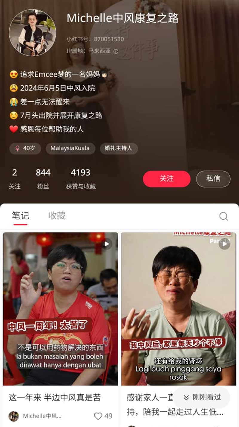 “我去看她时,Michelle刚中风没多久,很瘦、很虚弱。她常常哭,什么都不记得。以前的她太坚强、太理性了,总是独当一面,从不示弱。直到这次中风,她才发现,原来她的丈夫一直都很爱她。她说过,以前自己总觉得凡事要靠自己,但这场病让她学会了依靠,也学会了感恩。她现在更懂得体谅别人,也用自己的经历去鼓励其他中风病人。她告诉大家,只要有意志力、勤做复健,就一定能重新站起来。”