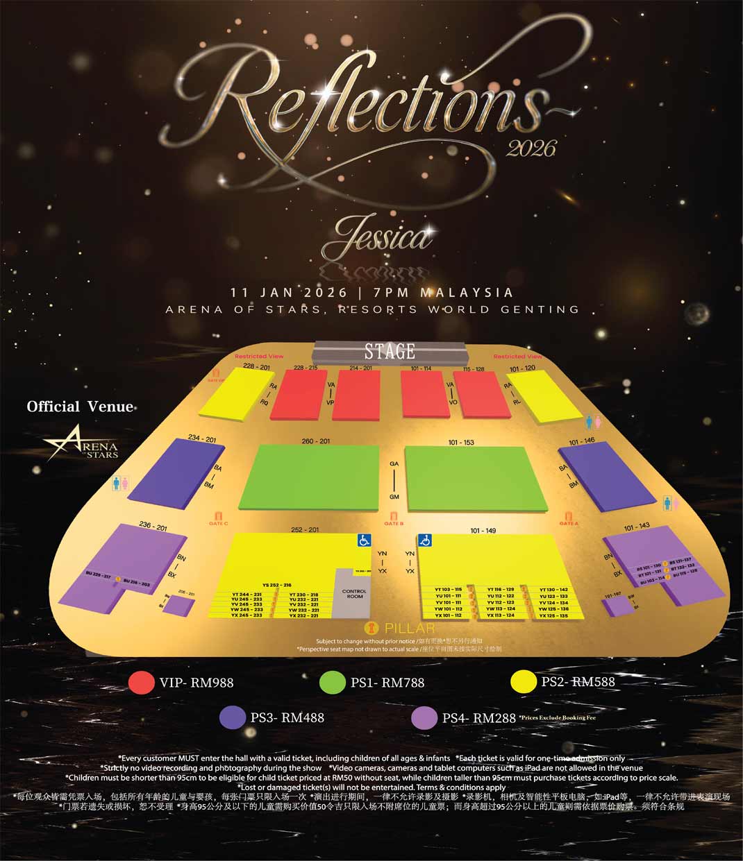 由汇视娱乐主办《Jessica 郑秀妍‘Reflections’ 2026 巡演-马来西亚站》,将于明年 1 月11 日(星期日),晚上 7 时于云顶世界云星剧场热情开唱。票价分别为 988 令吉(VIP)、788 令吉(PS1)、588 令吉(PS2)、488 令吉(PS3)及 288 令吉(PS4),所有门票不包含 4 令吉手续费。演唱会门票将于 11 月 20 日(星期四)下午 3 时起通过售票官网 Fantopia网站 www.fantopia.io 与云顶世界网站 rwgenting.com 发售。