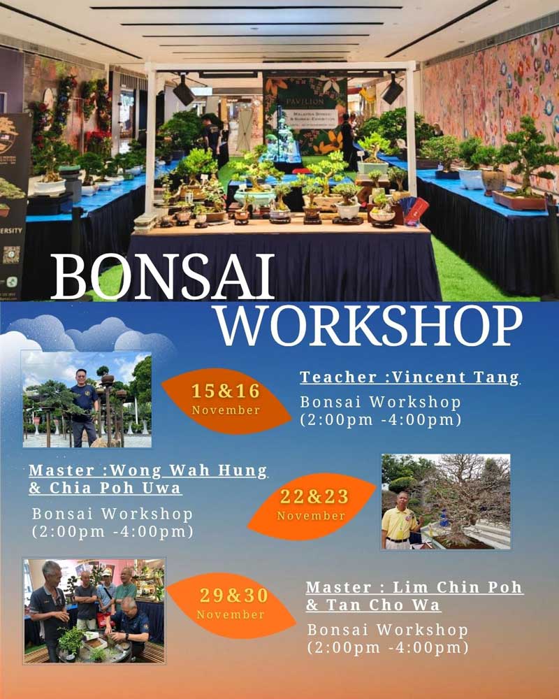 除了可观赏到不同面貌的盆景艺术,现场还有值得大家参与的教学活动,由三位马来西亚盆景大师亲自指导的三场独家盆景工作坊,包括11月15日-16日、11月22日-23日及11月29日-30日,时间为2点至4点,名额有限!