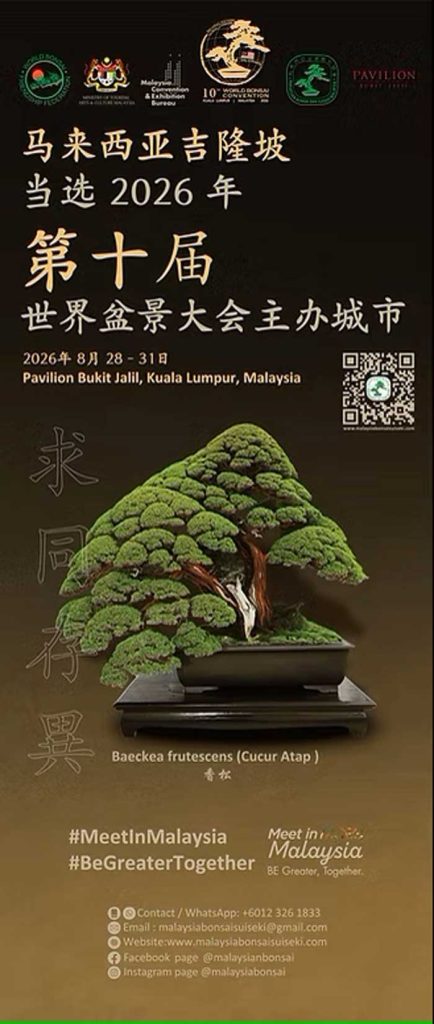 值得骄傲的是,吉隆坡当选为第十届世界盆景大会(WBC -WORLD BONSAI CONVENTION )主办城市,MBSS宣布将于2026年8月28日-31日在Pavilion Bukit Jalil 举行,承诺将会带来遍布世界各地不同的盆景艺术。盆景是一种活生生的艺术,所有人都能欣赏,因为它给每个人带来了和平与幸福。而世界盆景友谊联合会“通过盆景促进国际友谊和理解”的使命与马来西亚多元化的盆景社区产生了良好的共鸣,以盆景的艺术魅力将人们和社区联系起来,以展示多样性中的团结。