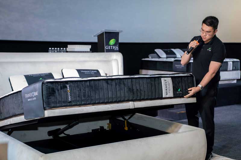 Getha 的 Miracle Latex 也比一般寝具材料弹性高达四倍,且经马来西亚橡胶局测试,比普通天然乳胶多出 1.5 倍弹性。为搭配 Transforme Miracle Latex 床垫,Kevin Tan 也宣布推出全新的Elevate床架,设计有优雅的曲线和 100% 天然乳胶软垫床头板。