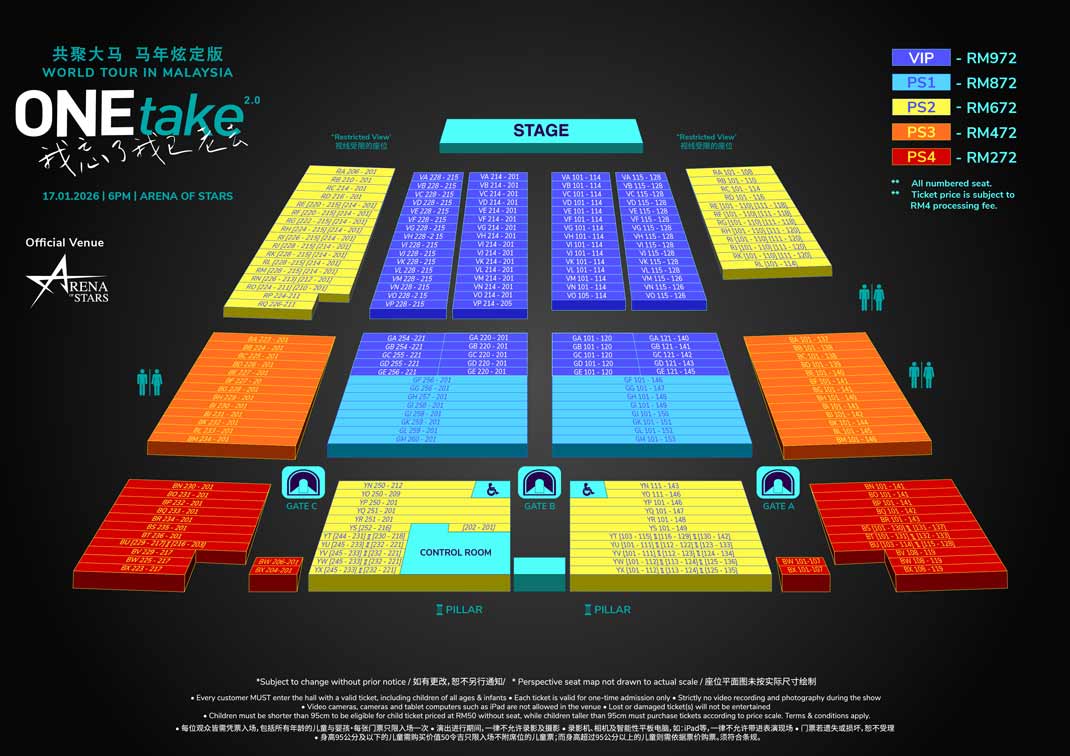 演唱会门票售价为 972 令吉(VIP)、872 令吉(PS1)、672 令吉(PS2)、472 令吉(PS3)及 272 令吉(PS4),所有票价未包含 4 令吉手续费。早鸟优惠将于 2025 年 12 月 9 日下午 3 点开售,VIP至 PS3 票位可享 25%折扣,数量有限,售完即止。早订优惠结束后, 凡通过云顶积分、信用卡或现金购票的云尊奖赏会员将可享有 10%折扣, 同样适用于 VIP 至 PS3 票位。