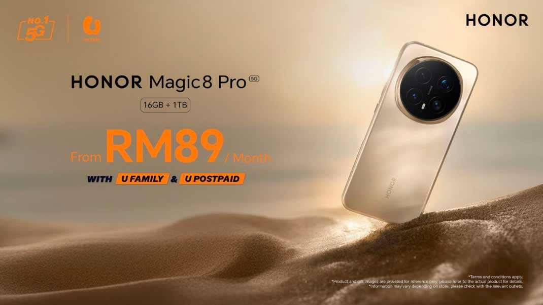 U Mobile 用户只需签购 U Family 或 U 后付配套,就能以每月 RM89 的价格把HONOR Magic8 Pro带回家,还可享受高达1,000GB 的 5G 数据流量,以及附带超过 60 个国家的免费全球漫游服务!查阅U Mobile 官方网站,了解配套条款和覆盖的漫游目的地。