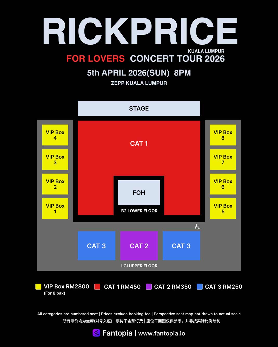 票价: RM250, RM350, RM450, RM2800 (贵宾厢房-8 位)