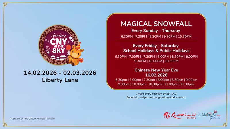 从荧幕走进现实,这段故事在云顶天城世界主题乐园的沉浸式体验馆(Genting SkyWorlds Immersive Studio)继续展开。农历新年主题沉浸式影像体验以环绕式视觉与节庆叙事,呈现新春的色彩与情绪,让宾客从不同角度感受新年的节奏。农历新年主题沉浸式影像的体验将于2026年1月9日至3月3日每日开放,并配合云顶天世界主题乐园的指定时段进行。
