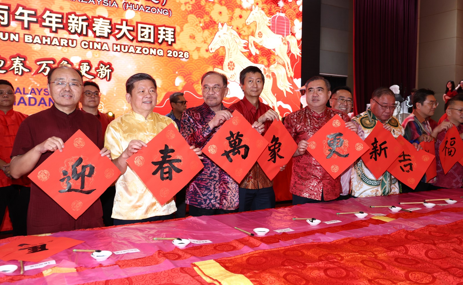 致词结束后,安华与多名内阁正副部长及华总领袖一同挥春,完成主题为“骏马迎春·万象更新”的书法作品,象征丙午马年到来之际,国家与人民马力全开、昂首前行,更加显示出全民文化交融和多元共存的特征。