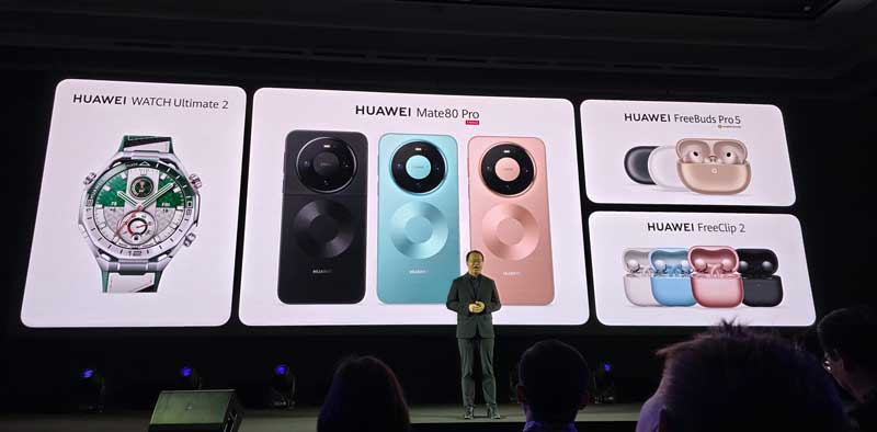 此次发布会还推出了多款HUAWEI生态系统新品,包括HUAWEI FreeBuds Pro 5、HUAWEI WATCH Ultimate 2(绿色)和HUAWEI FreeClip 2(玫瑰金),进一步丰富了华为的智能设备产品线,将生产力、娱乐和日常生活体验无缝连接。