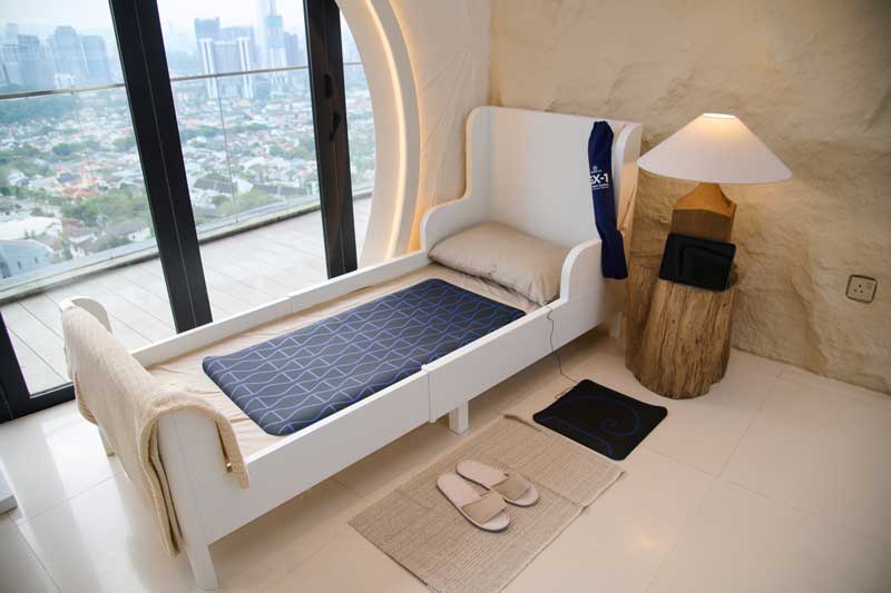 GX-1 适用于家居和办公室,无需电源、充电、电池或任何外接电力。作为非供电产品,它不会产生电流或释放任何信号。系统配备一条导电连接线,将主垫与辅助地面接触垫连接。其设计旨在融入日常休息和放松时段,使之成为健康生活的辅助工具。