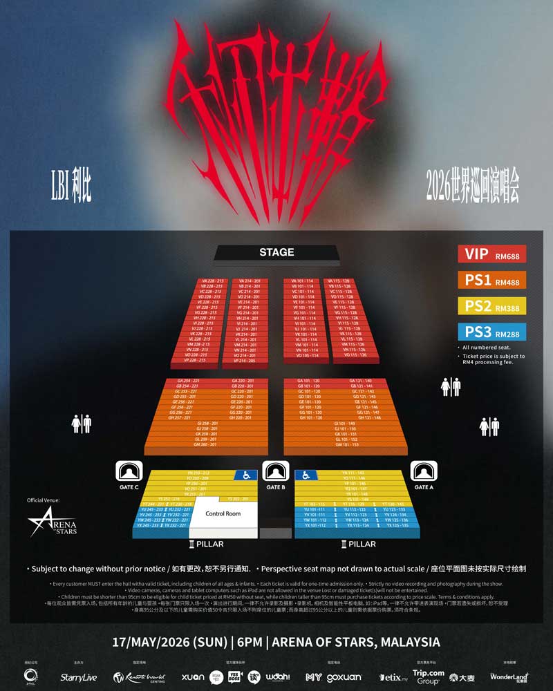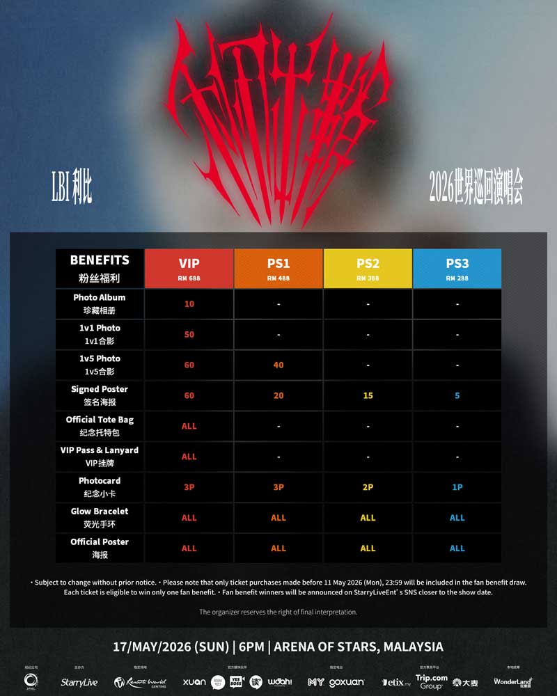 《LBI利比[利刃出鞘]2026世界巡回演唱会–马来西亚站》门票价格分别为688令吉(VIP)、488令吉(PS1)、388令吉(PS2)及288令吉(PS3), 所有票价未含手续费。