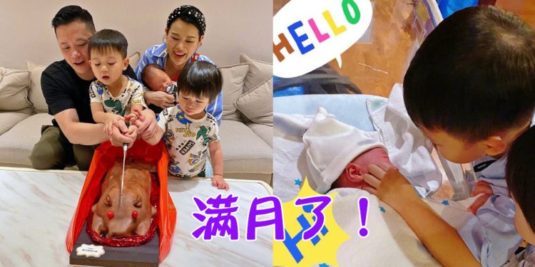 胡杏儿小儿子满月,一家五口切乳猪蛋糕庆祝