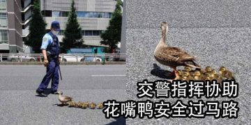 呆萌花嘴鸭带宝宝闯红灯 暖心日警指挥协助
