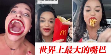 全球最大嘴巴狂赚钱 女子一口塞大包装薯条